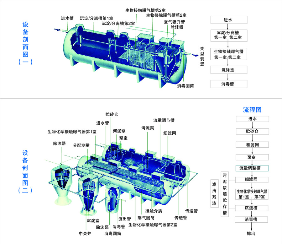 2、缺氧池:缺氧为脱氮处理而设置,经过格栅分离后的污水自流进缺氧池与接触池中的回流硝化液相混合,缺氧池中放置NZP-II型填料作为反硝化细菌的载体,填料对氮、磷、硫化物去除效果好,停留时间为2小时与前续工艺中的污泥池相结合形成A/O法处理工艺,从而达到脱磷、脱氮的目的。(仅WSZ-FC型设备有消毒池)