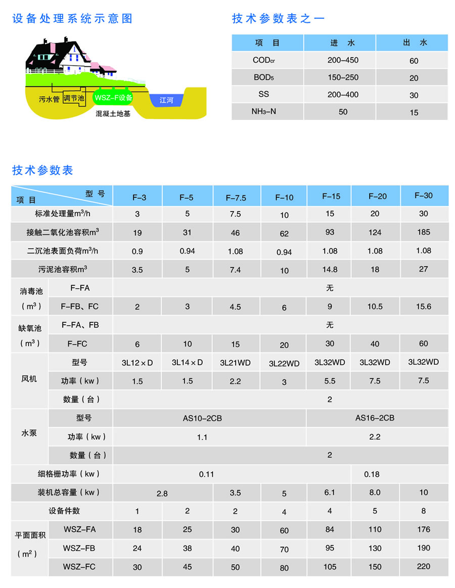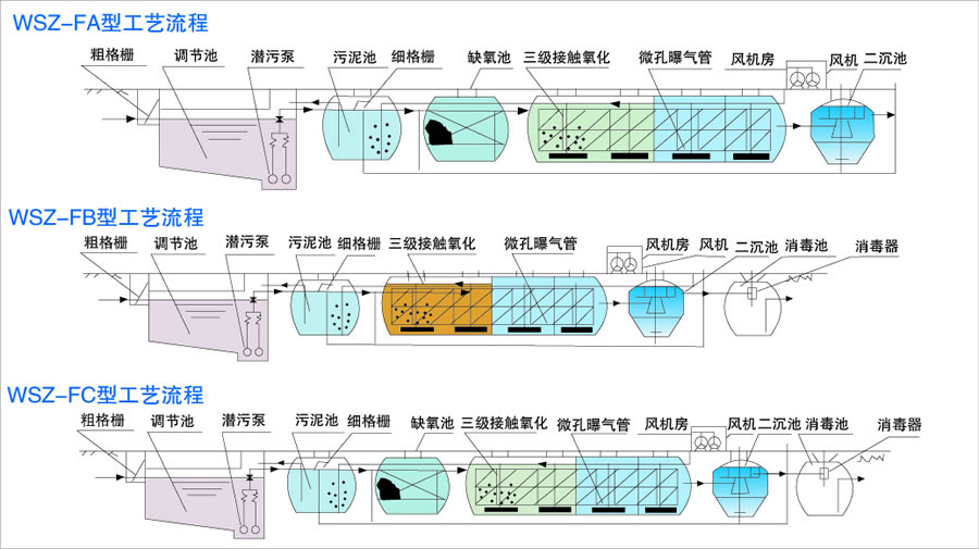 WSZ-F(A/B/C)型污水处理设备主要用于生活污水和与之类似的工业有机废水的处理,其主要处理方法是采用目前较为成熟的生化处理技术-生物接触氧化法,水质设计参数按一般生活污水水质设计计算,按BOD5平均200mg/l,出水BOD5按20mg/l设计。