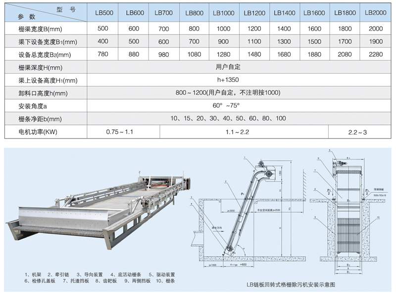LB型链板往复式格栅除污机是我公司生产的一种能够连续工作的清污设备,由栅条拦截液体中的杂物,耙齿板从栅条背面下降至底部后,回转至栅条的前面,由下而上地将栅渣提升至卸料口排出,达到固液分离的目的,宽度可达4米之多。耙齿板由二侧的板式链牵引,作循环运行,耙齿板的间距为1.2m~1.5m,可有效拦截较大杂物。