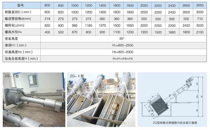 该设备与水平面成35度安装在水渠中,污水从转鼓的端头流入鼓中,水通过转鼓侧面的栅缝流出,格栅将水中的悬浮物、漂浮物等留在转鼓中,转鼓以一定的速度旋转,鼓的上方有尼龙刷和冲洗水喷嘴,将栅渣清除并通过螺旋输送运转挤干,脱水,运至上端排料斗,经输送机运走。