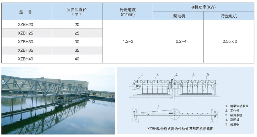 主要由工作桥、虹吸装置、吸泥装置、中心旋转支座及集电装置、清扫装置、控制柜、扶梯、排渣斗、浮渣挡板、端梁及驱动装置、刮渣耙、出水堰板等部件组成。