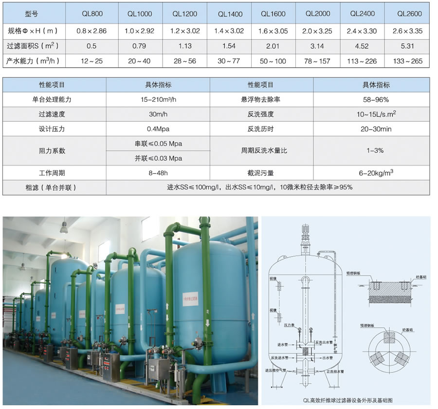 QL型高效纤维球过滤器 字号:大中小 产品详细介绍: 设备特点 1、滤料先进,效率高。 2、相对体积小,成本低。 3、纤维抗腐,寿命长。 4、纤维比重小,运行重量轻。 5、使用周期长。 应用范围 QL高效纤维球过滤器与众多的过滤器用途一样,去除水体中悬浮物,所不同的是其滤料是将纤维丝做成多种形状,有效提高了过滤效果和过滤精度,一般作为中等精度过滤用。 技术参数