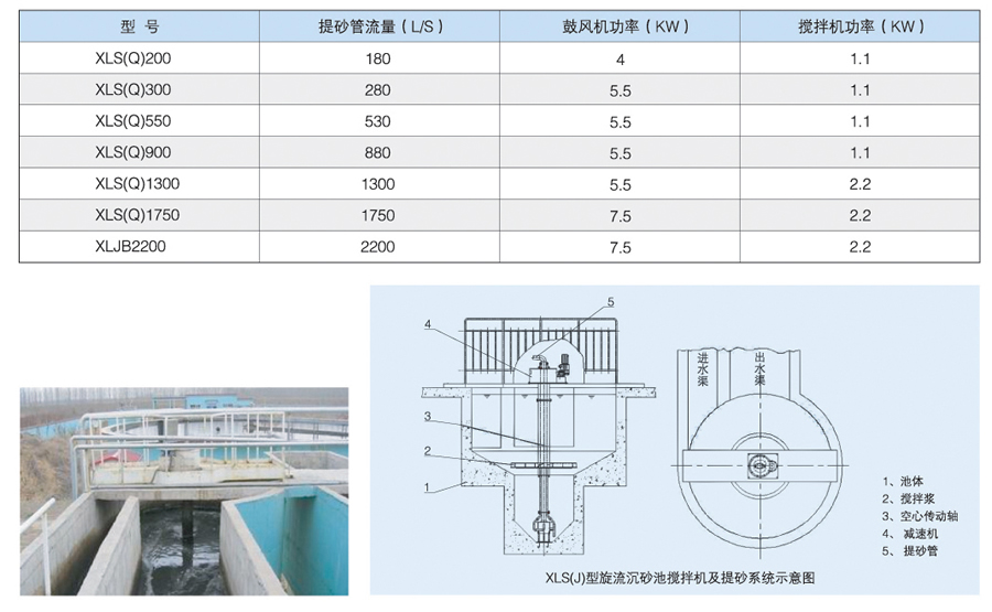 该设备在搅拌机的中空轴上,装有气提提砂系统。两根进气管通入压缩空气将砂斗内的沉淀砂,吹起松动。由于压缩空气的作用,使砂斗的压力小于水位压力,使浓缩了的砂水混合物沿中轴线上的提砂管提升到砂水分离器中去进行处理。
